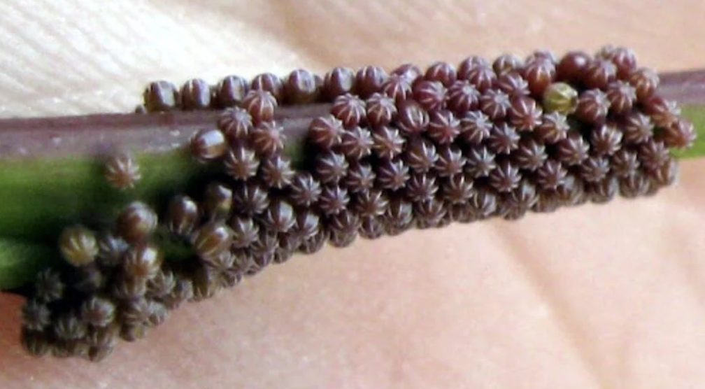 Let’s start with the eggs. The photo showcased a close-up of these eggs adorning a leaf, resembling delicate black lace gracefully draped over its surface. Once the initial astonishment subsided, their beauty became evident. Laid in clusters, each egg is a marvel of geometric precision. Initially, I oscillated between anticipation and dread, pondering their potential impact on my garden.