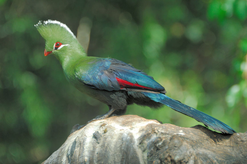 The Knysna Turaco is a medium-sized bird, measuring about 45 cm in length and weighing between 200 and 300 grams. It is known for its striking appearance, with bright green and purple feathers, a red crest on its head, and a long, curved beak. Its wings are a deep blue, while the tail is a bright crimson. The Knysna Turaco’s eyes are yellow, adding to its unique appearance.