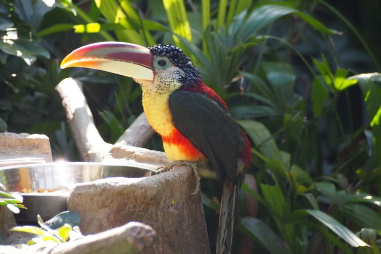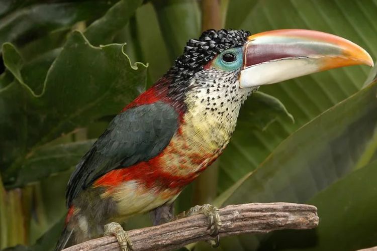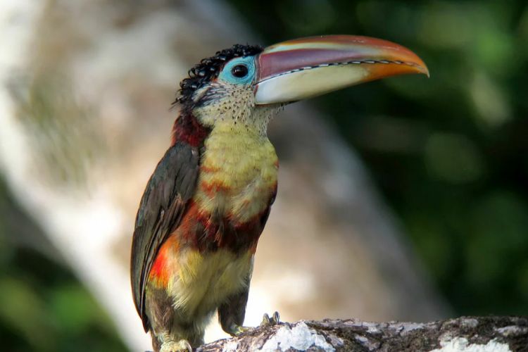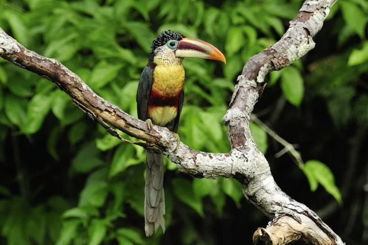 The appearance of the Curl-crested is physical. The Aracari is a medium-sized toucan relative renowned for its distinctive appearance. Its plumage is a kaleidoscope of colors, with a black body, white thorax, vibrant yellow neck, and brilliant red undertail coverts. However, the bird’s most remarkable feature is its elegantly curled crest atop its head, which adds an additional dash of grace to its already stunning appearance.