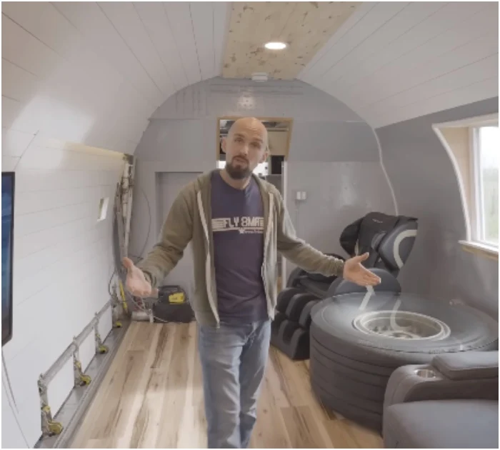 Spanning approximately 700 square feet, the interior features a mudroom, mechanical room, and living area. The design preserves the original cargo door, a cockpit equipped with a flight simulator, and plans to integrate flight controls with Microsoft’s simulator.