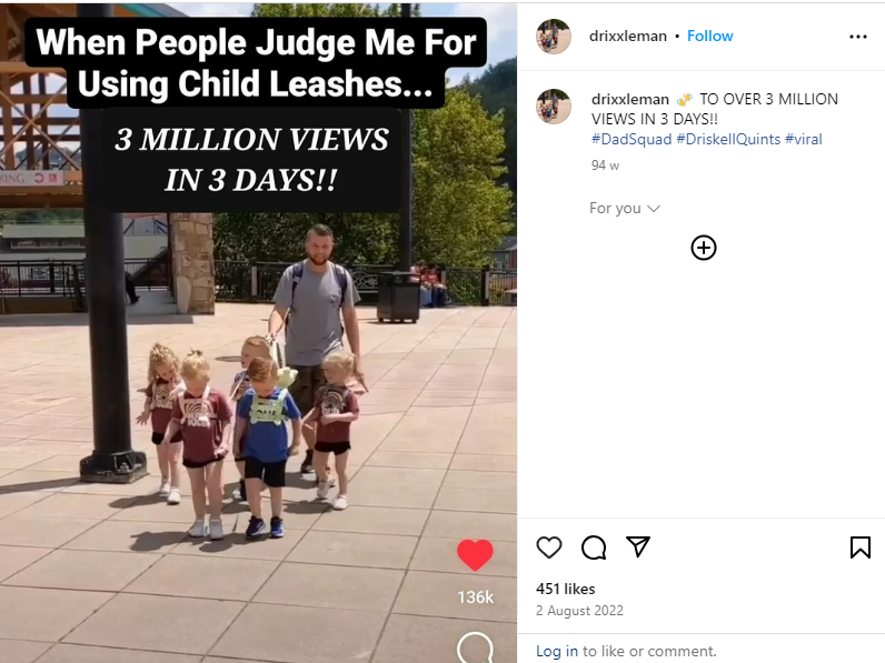 Driskell posted a video of the family’s outing to the acquarium that caused a lot of negative feedback directed towards the parents. The video of the kids on leashes went viral with over 3 million views. Hundreds of people commented about how the children were not animals and hence should not have been leashed.