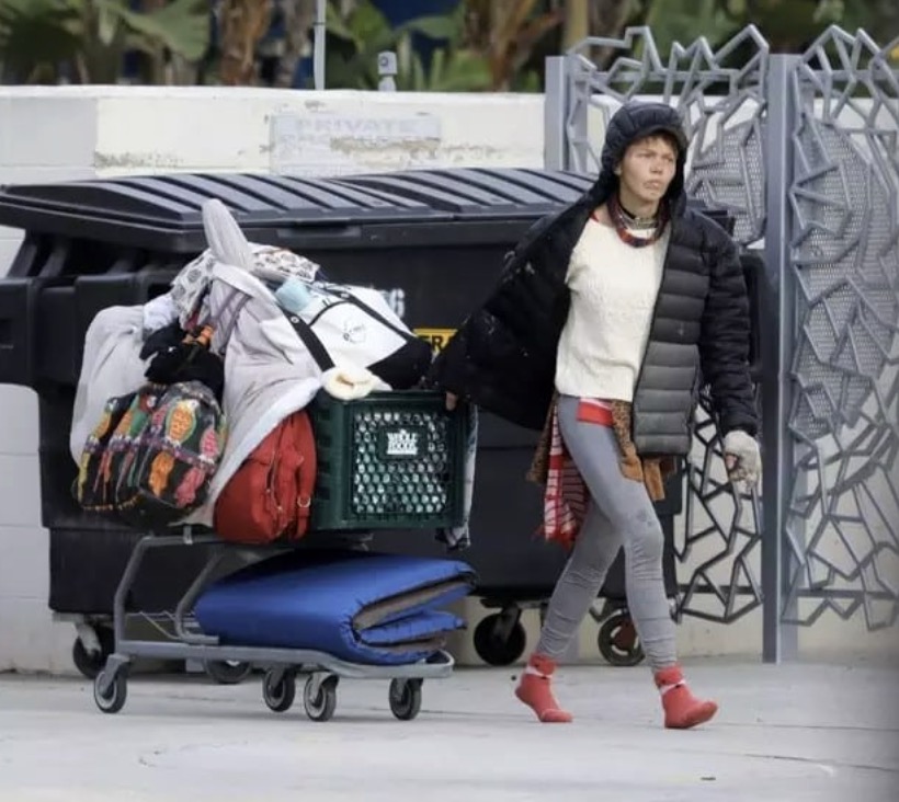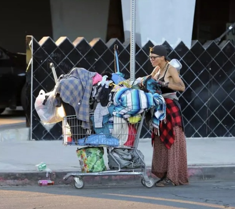 The once gorgeous blonde model is unrecognizable in the her dumpy, dirty clothes.