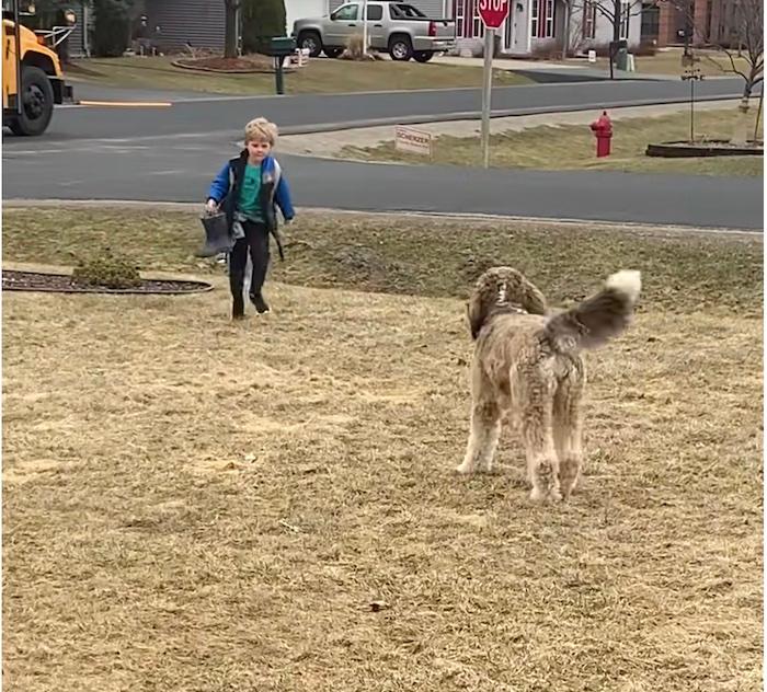 This heartwarming video of a family dog greeting his human brother after school has captured the hearts of millions online. The Bernedoodle dog is seen patiently waiting for the little boy to return home, showcasing pure love and affection.