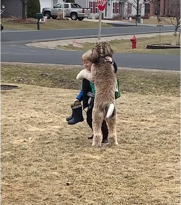 As the boy steps off the school bus, the dog approaches him in a touching gesture that has melted the hearts of over 7 million viewers. Rather than running towards him, the dog stands on two legs and wraps his arms around his little human, creating a truly heartwarming moment.