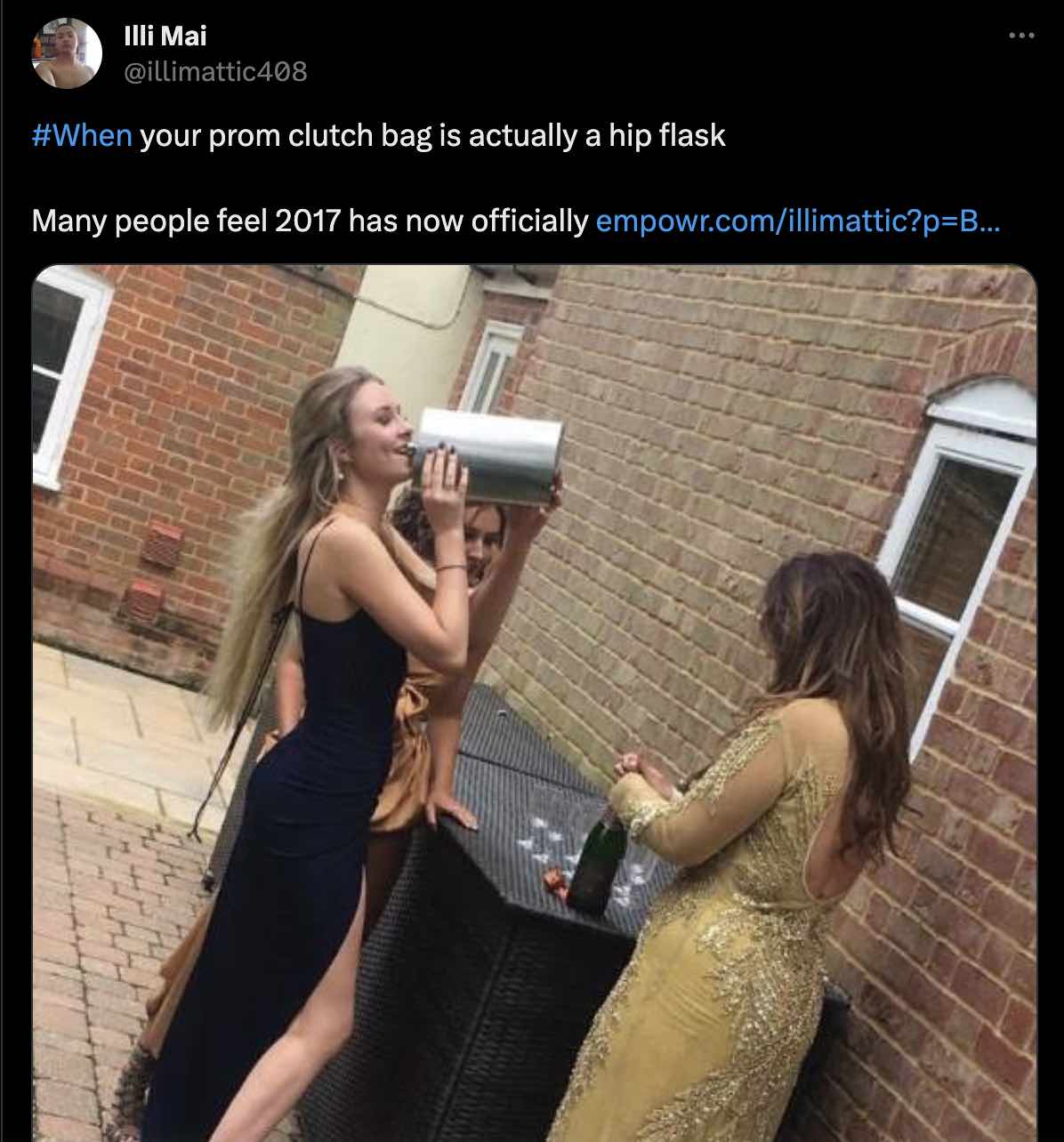 “Still don’t know how I got away with a huge hip flask as my prom clutch,” she wrote on on X (previously Twitter).