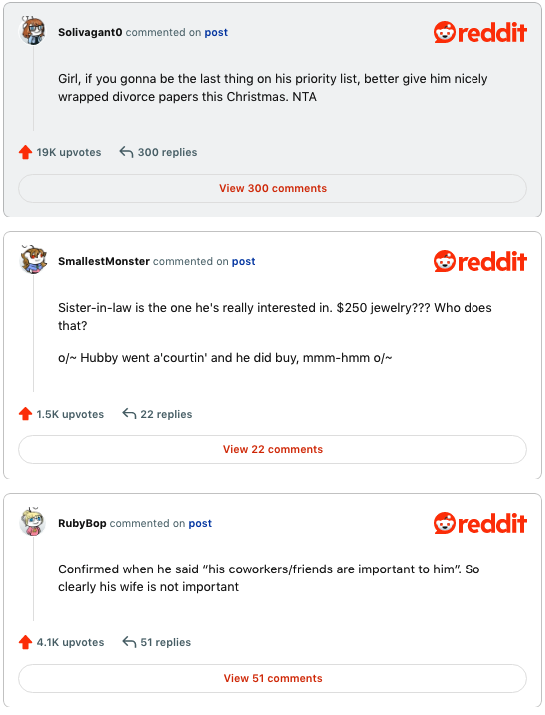 One user commented, “If one of my coworkers spent so much more on me than on their own spouse, I would be SERIOUSLY weirded out.” Another added, “If my BIL got me a $250 bracelet, I’d be extremely uncomfortable. Throw in the fact that he only spent $20 on spoons for his wife, and I’d be appalled.”