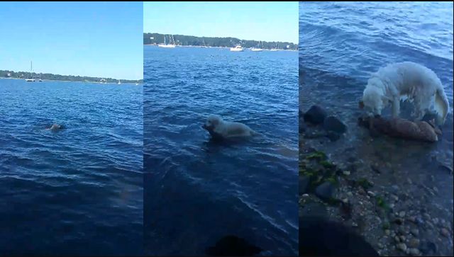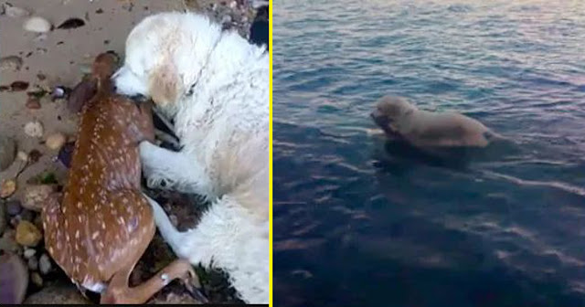 Storm, a golden retriever, was out for a morning walk in Long Island Sound with his owner, Mark Freeley. The pair came across a fawn drowning in the water due to wind gusts and stormy weather conditions that made it too dangerous to get close enough, and traditional care would be unable to help this poor animal, so Storm took matters into his own hands! He gently picked up the baby deer by the neck and gently dragged her safely onto land where she could rest while he stood guard over them both until the Animal Rescue League of Long Island arrived.