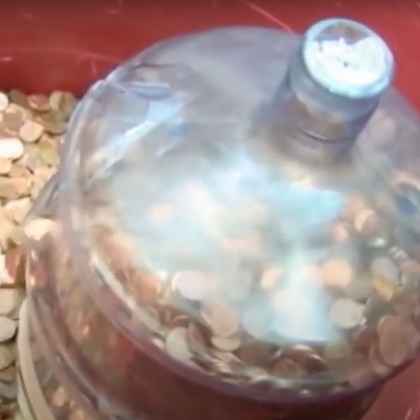 Filling up giant water jugs with pennies.
