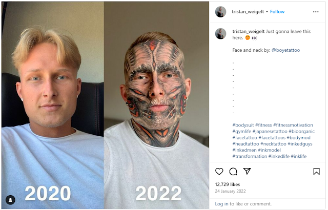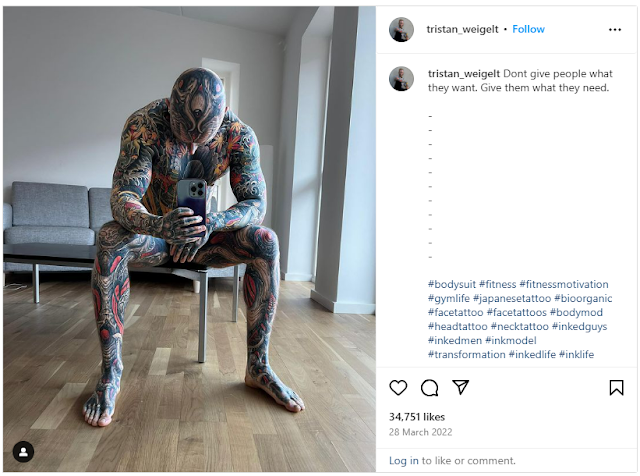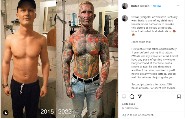 A tattoo apprentice named Tristan Weigelt, aged 26 and adorned with extensive body art, gained attention by revealing his appearance before transforming his body into a canvas.