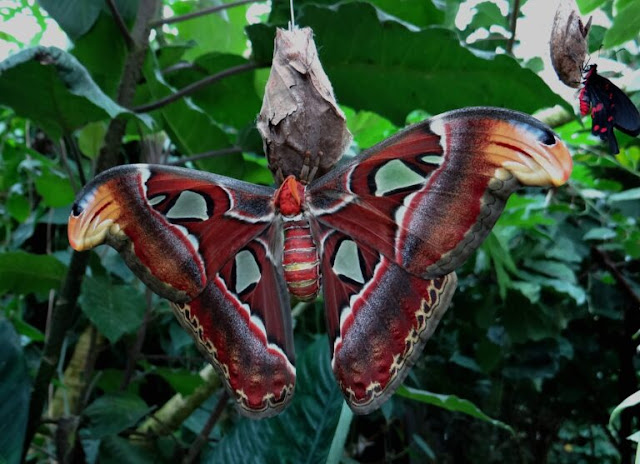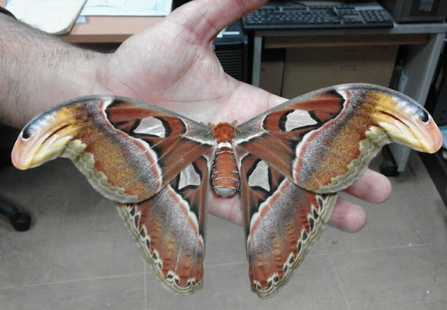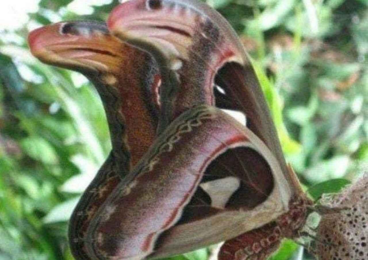 The trio of “snakes” turned out to be an optical illusion created by a part of the wings of two different moth species, the Atlas moth. This unique moth, found in the forests of Asia, can mimic the appearance of a snake. With wings reaching up to 24 cm (9.4 in) in wingspan and a wing surface area of about 160 cm2 (≈25 in2), the Atlas moth is one of the largest species of butterflies and moths.