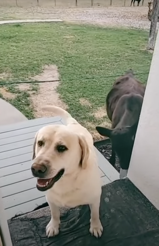 Known for their friendly nature and love for making new friends, this Labrador’s enthusiasm led him to bring home a baby cow after a stroll around the family farm. The duo patiently waited for the door to open, signaling the puppy’s eagerness to show off his new buddy.