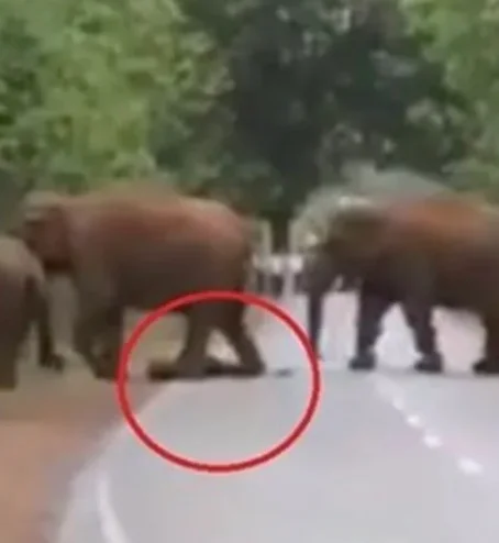 A magnificent elephant herd gracefully crosses the road, each step reflecting their size and harmony. One elephant stands out, gently cradling something in its trunk. Viewers soon realize that the elephant is carrying a lifeless elephant calf. The herd somberly halts, and the elephant carefully places the deceased calf on the ground, with others forming a circle of respect. This poignant moment conveys a shared sense of sorrow and mourning.