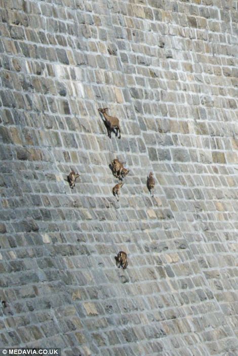 Head for heights: These incredible pictures show the moment a herd of sure-footed mountain goats climbed up an almost vertical dam in search of salt