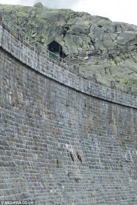 Skilled: The gravity-defying goats typically live in very steep and rocky terrain at altitudes of up to to 4,600m and have no fear of falling whether climbing up or down the dam wall
