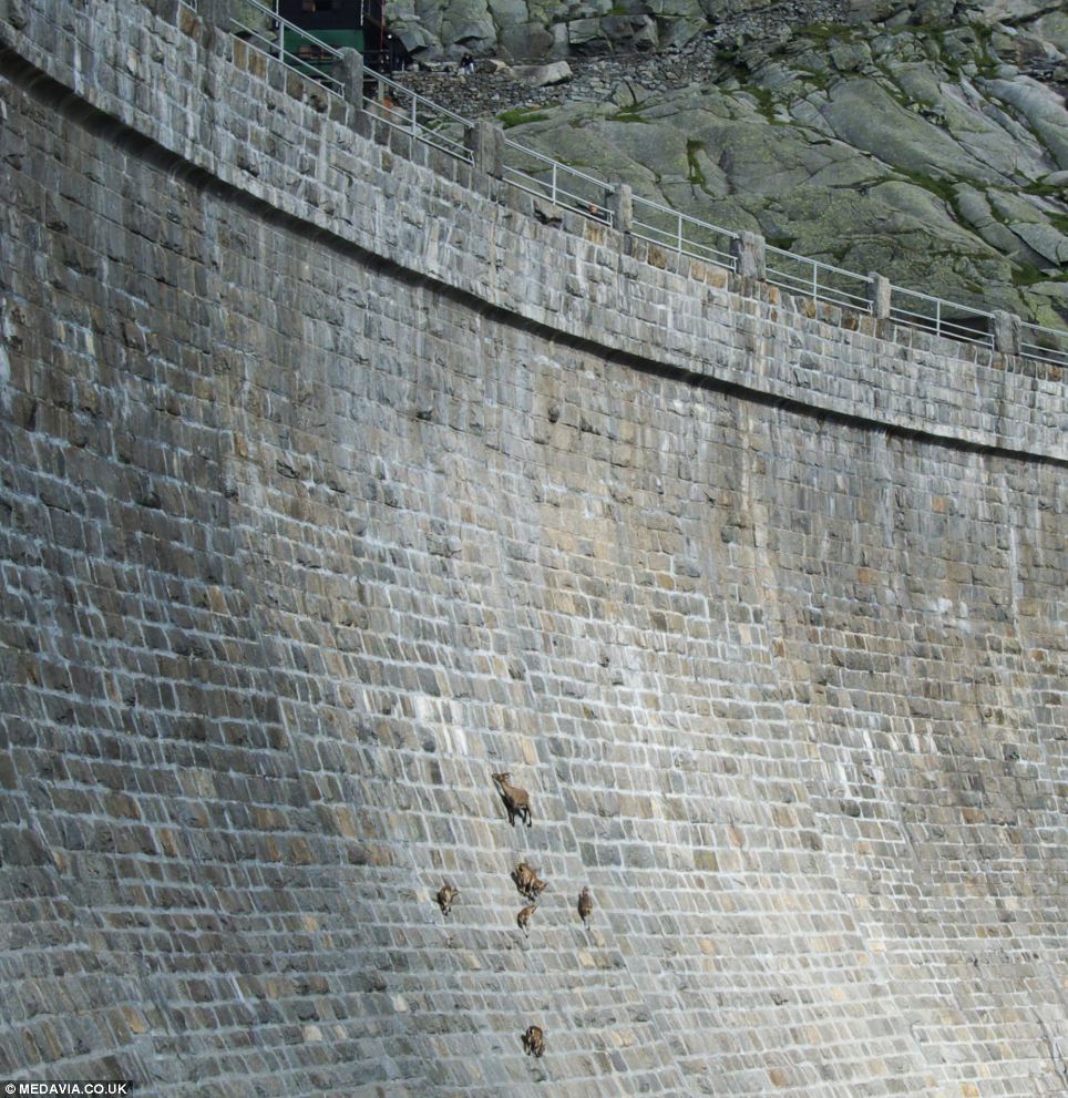 The gravity-defying goats typically live in very steep and rocky terrain at altitudes of up to to 4,600m and have no fear of falling whether climbing up or down the dam wall.
