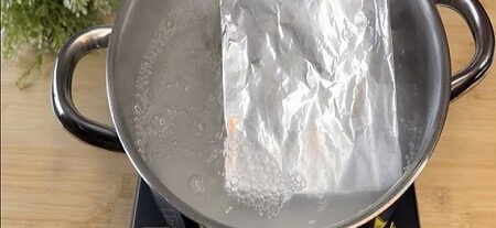 After the mixture starts boiling, divide a sheet of aluminum foil into four equal parts. Roll each segment into a ball and add these aluminum balls to the boiling pot.