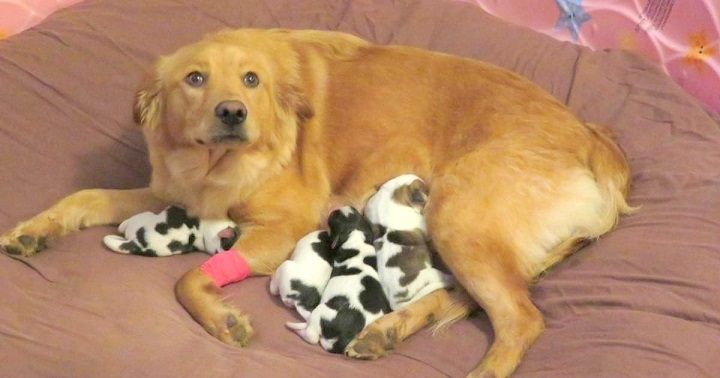 Unlike the gold-coated mama Rosie, the puppies were a spotty lot. The black and brown marks on their white fur made them eerily resemble a bunch of tiny baby cows! Fittingly, they were given the bovine names of Daisy, Clarabelle, Betsy, and Moo.